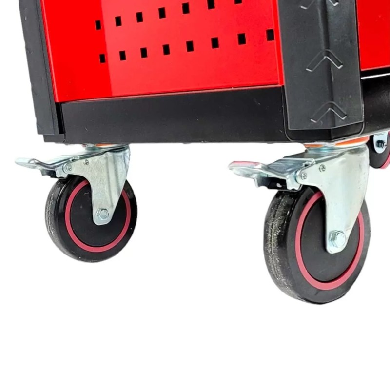 Grâce à sa poignée ergonomique intégrée dans le plan de travail et ses roulettes avec frein promenez là partout dans votre atelier et ayez toujours l’outil qu’il vous faut. Accédez rapidement à vos outils rangés dans des tiroirs montés sur glissière télescopique avec roulement à billes. Son système anti-renversement vous garantit une stabilité à toute épreuve. Le plan de travail est conçu en matériaux antichocs qui résisteront à toutes vos manipulations sur votre servante.