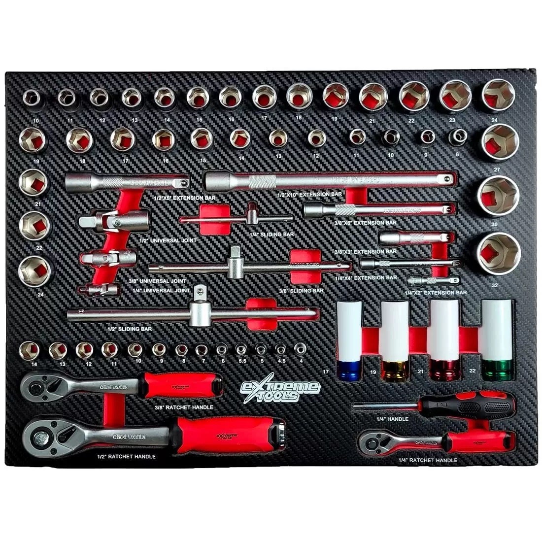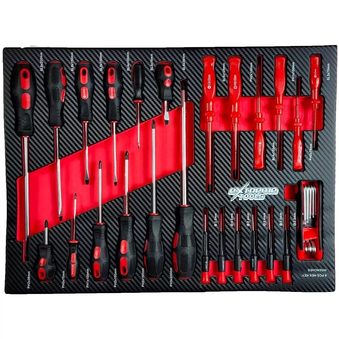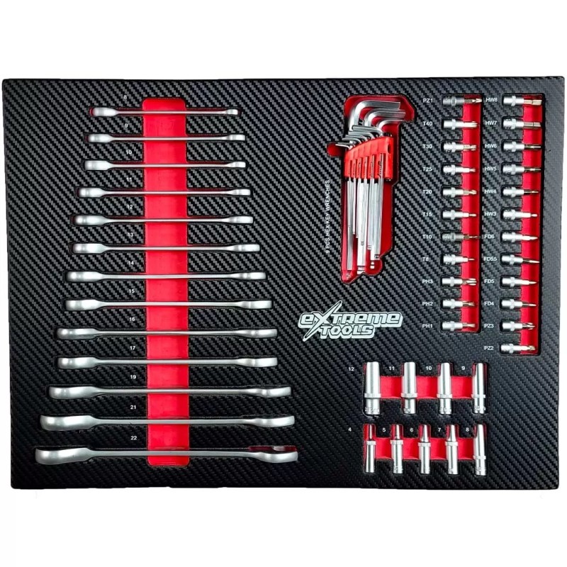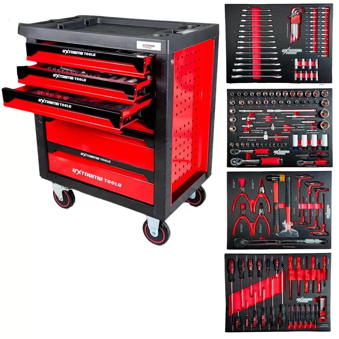Cette servante d'atelier se compose de 6 tiroirs dont 4 pleins d’outils de qualité professionnelle : 162 pièces de la marque de renommée Extreme Tools, rangées par types et par tailles dans des compartiments en mousse.